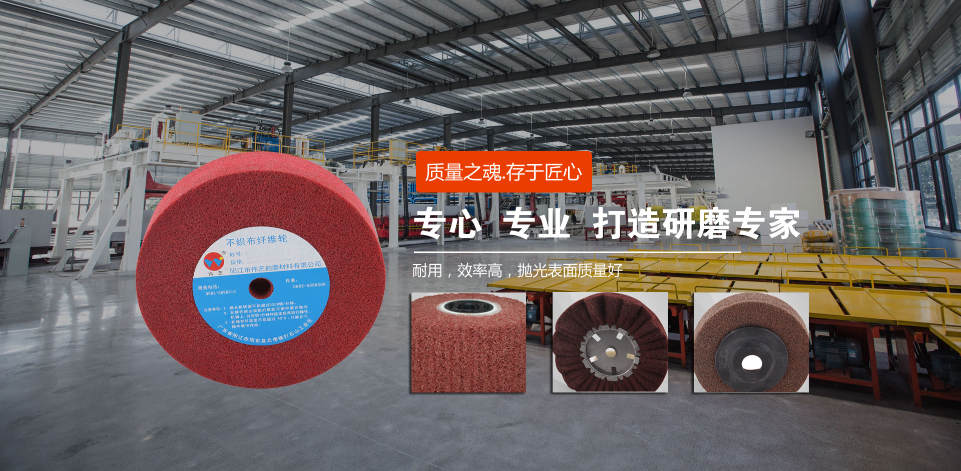 陽(yáng)江市偉藝拋磨材料有限公司座落于中國(guó)刀剪之都——陽(yáng)江市,具有近二十年尼龍輪生產(chǎn)和銷(xiāo)售經(jīng)驗(yàn),生產(chǎn)基地占地面積4.6萬(wàn)多平方米。偉藝公司立足自主研發(fā),致力于產(chǎn)業(yè)化發(fā)展?,F(xiàn)已研發(fā)、生產(chǎn)了尼龍輪、擦色輪、飛翼輪、拉絲輪、清潔拋、不織布刷輥、工業(yè)擦布、塑膠研磨石、金剛砂、噴膠棉等十多種應(yīng)用于多種領(lǐng)域的研磨材料,并可以根據(jù)客戶的需求提供針對(duì)性解決方案和個(gè)性化服務(wù)。 偉藝公司致...